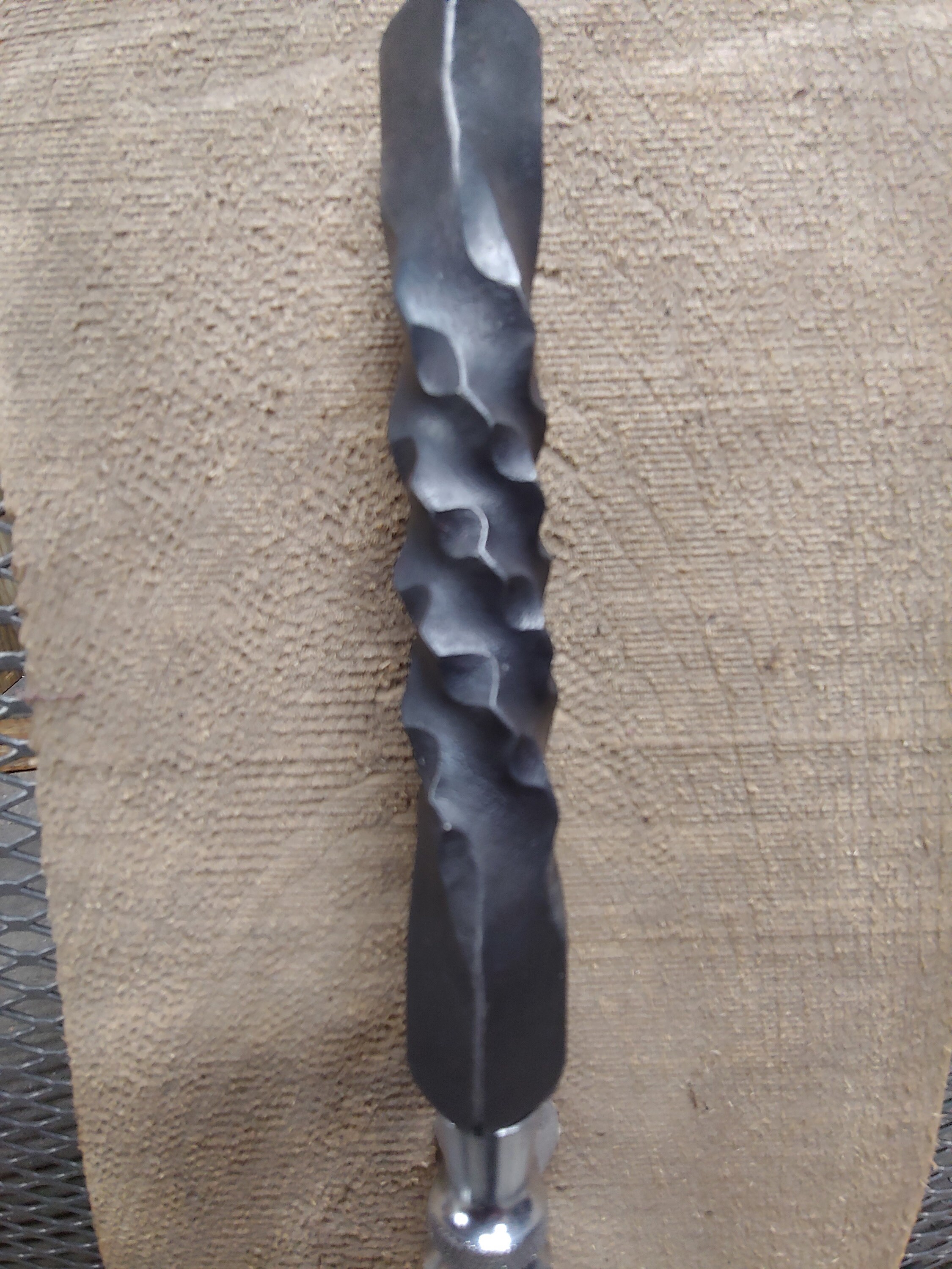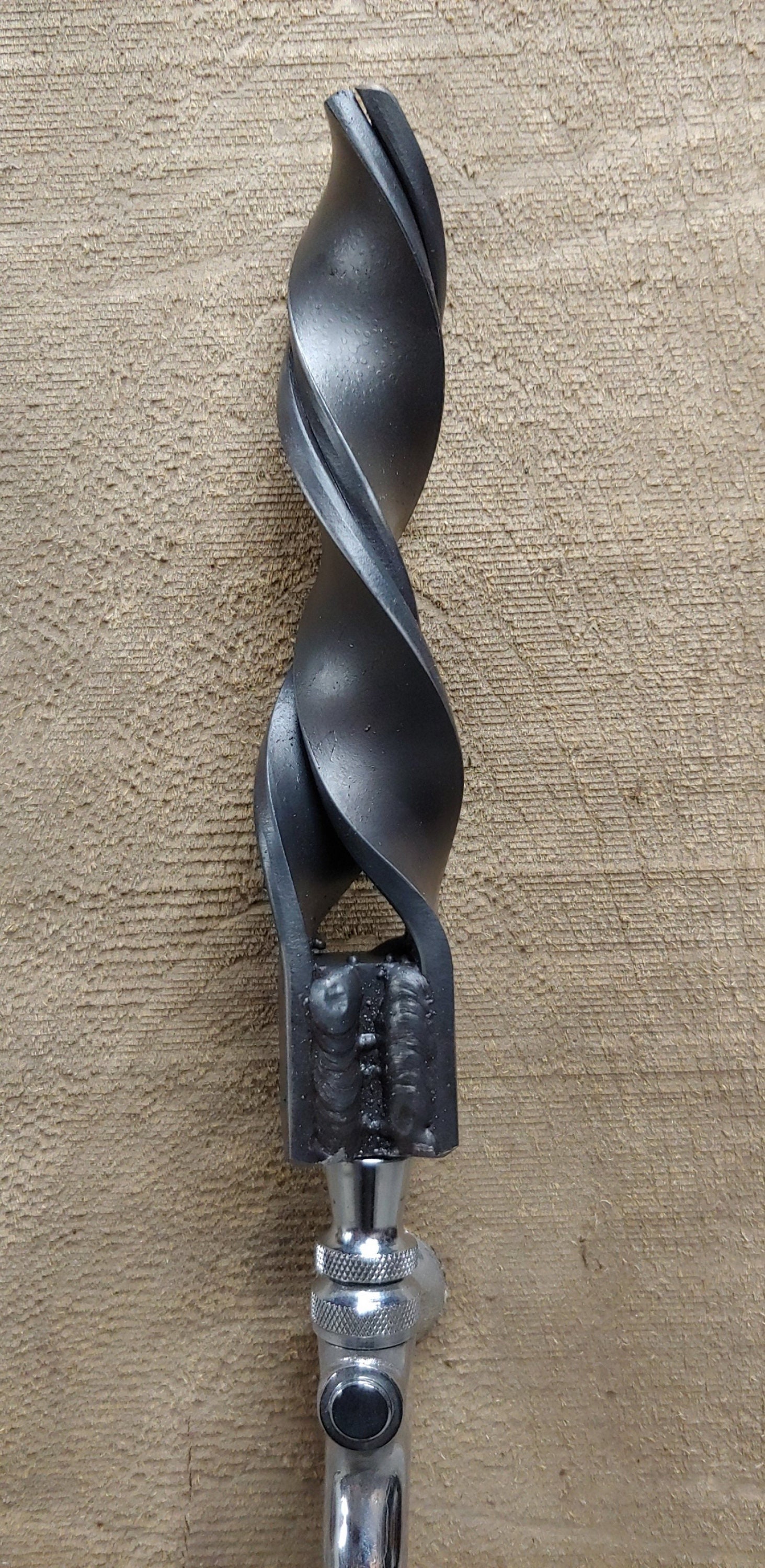 Choose from the Coral pattern tap handle, the smashed twist, the ribbon twist, or the rose thorn twist. The Coral pattern beer tap handle is made from round stock and is hammered and textured in a way that resembles coral. The ribbon twist is made by welding 2 pieces of flat bar to a square base and then twisting them at a orange heat. The welds are left visible on the tap handle.