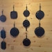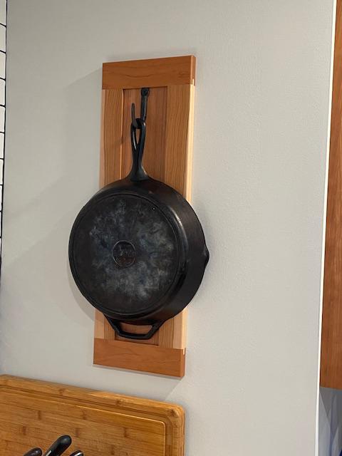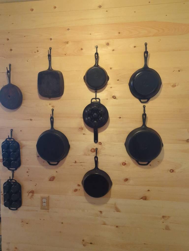 Hand forged kitchen hooks designed for hanging cast iron skillets. These hooks feature a flat taper that easily allows skillets to slide on and off of these hooks. We all know how valuable our cast iron skillets are. So why hide them away in cabinets and drawers when they can be proudly displayed on these hooks and within easier access.