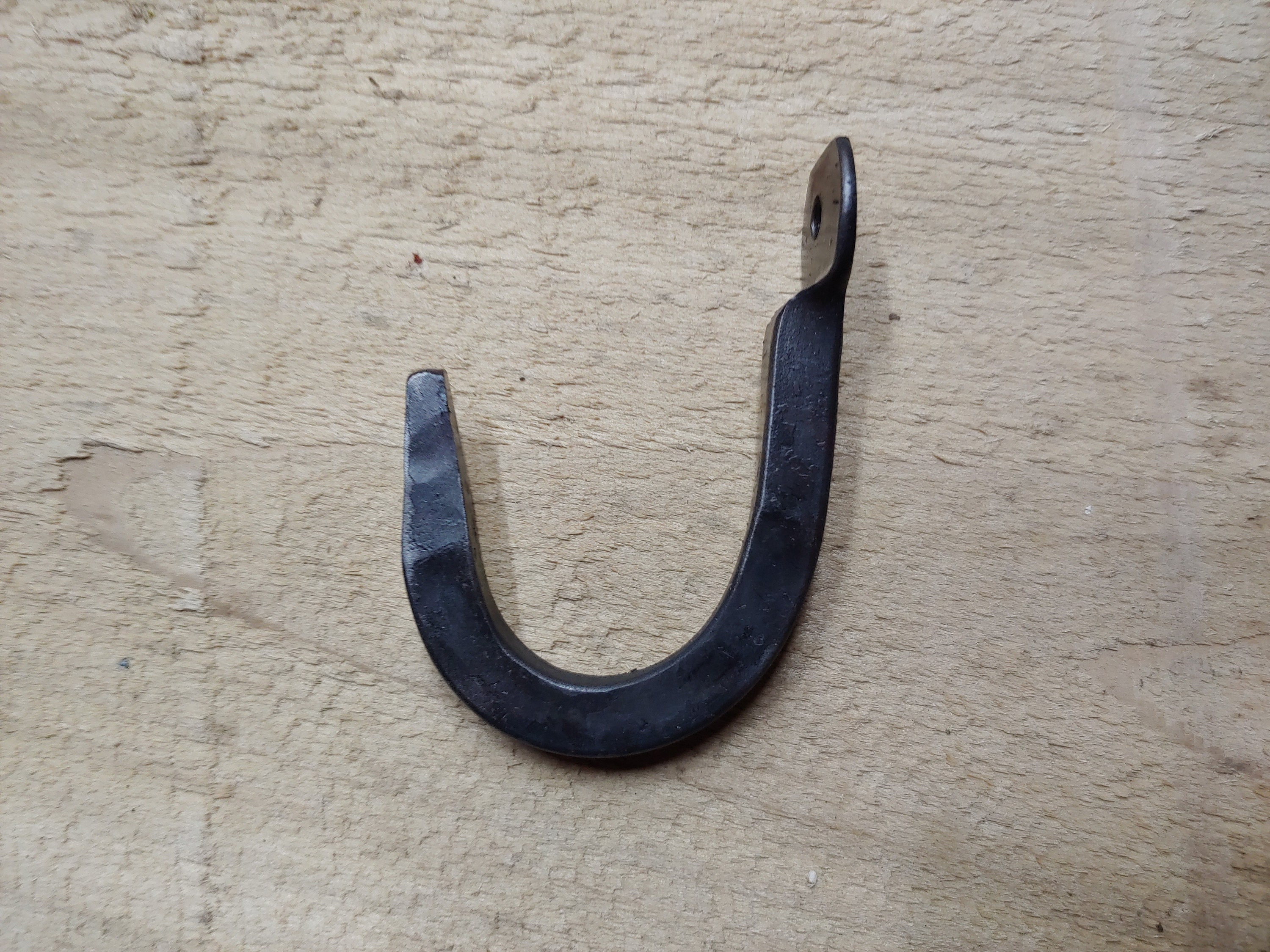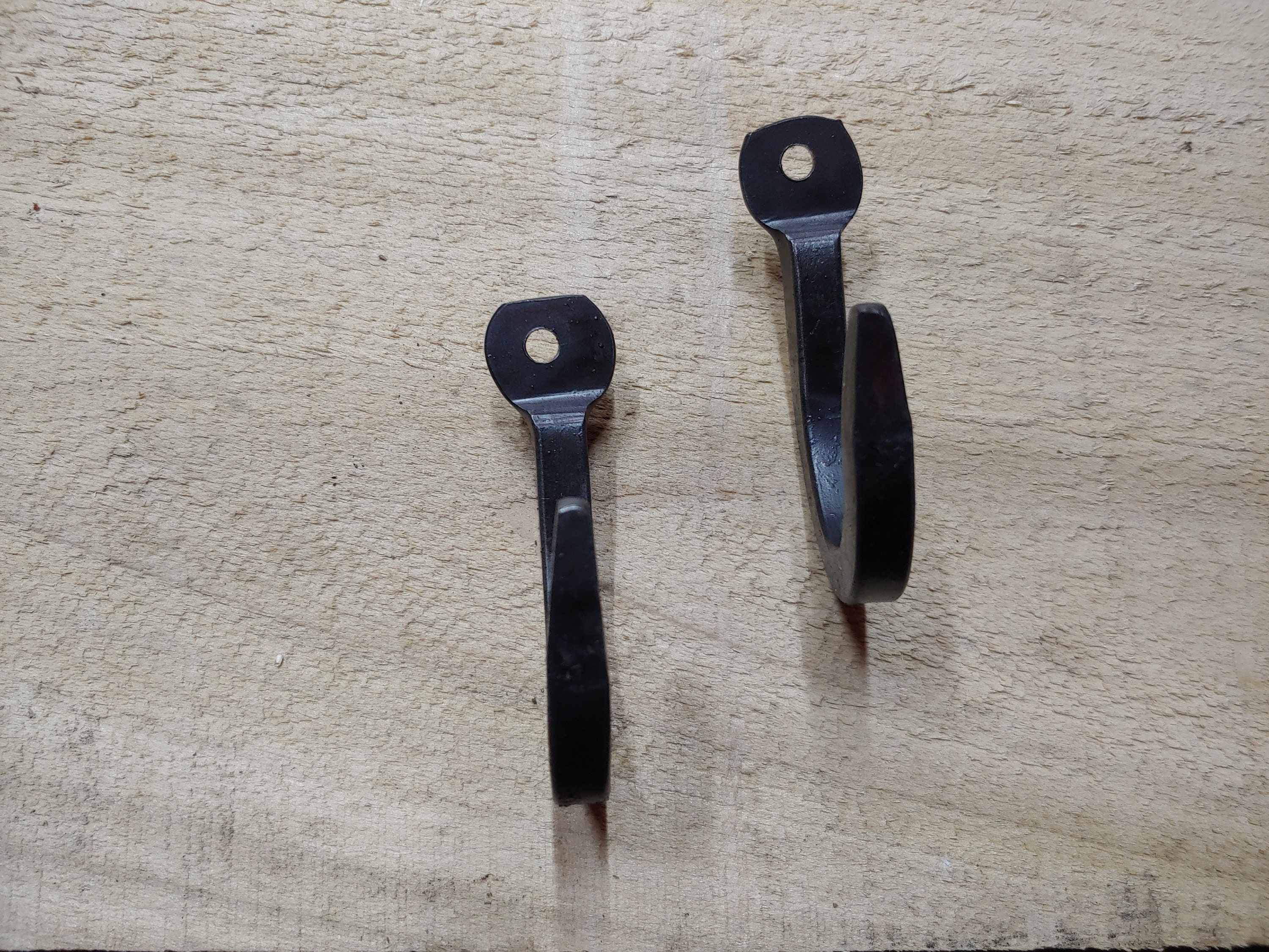 Hand forged J Hooks are designed to bring a rustic and industrial look to any room of your home. Our j hooks are forged from 3/8" solid square bar. One end is drawn to a short taper point and then bent to form the hook. The tab is formed on the anvil with half on, half off hammer blowers. The j hook has been heated to a black heat and then a wax is applied to give it a black color and protective finish.